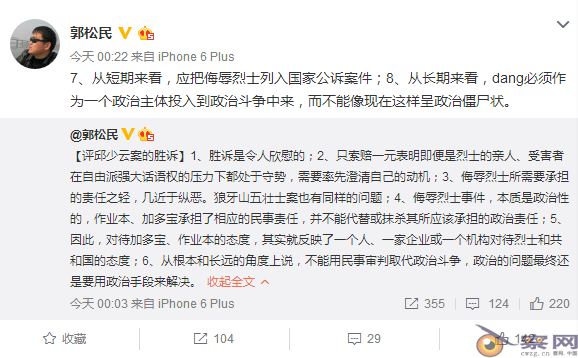 郭松民【评邱少云案的胜诉】1、胜诉是令人欣慰的;2、只索赔一元表明即便是烈士的亲人、受害者在自由派强大话语权的压力下都处于守势,需要率先澄清自己的动机;3、侮辱烈士所需要承担的责任之轻,几近于纵恶。狼牙山五壮士案也有同样的问题;4、侮辱烈士事件,本质是政治性的,作业本、加多宝承担了相应的民事责任,并不能代替或抹杀其所应该承担的政治责任;5、因此,对待加多宝、作业本的态度,其实就反映了一个人、一家企业或一个机构对待烈士和共和国的态度;6、从根本和长远的角度上说,不能用民事审判取代政治斗争,政治的问题最终还是要用政治手段来解决。7、从短期来看,应把侮辱烈士列入国家公诉案件;8、从长期来看,dang必须作为一个政治主体投入到政治斗争中来。