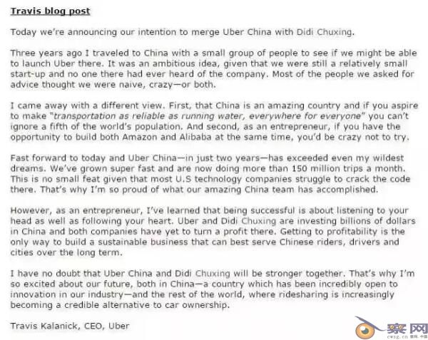 Uber CEO的合并的博文属实