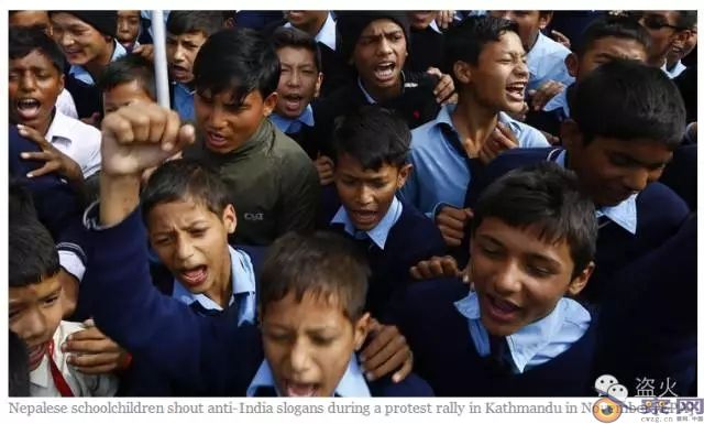 在9月,加德满都的一场抗议集会中,尼泊尔的学生们高喊着反对印度的口号。[EPA]