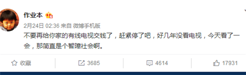 作业本:不要再给你家的有线电视交钱了,赶紧停了吧,好几年没看电视,今天看了一会,那简直是个智障社会啊。