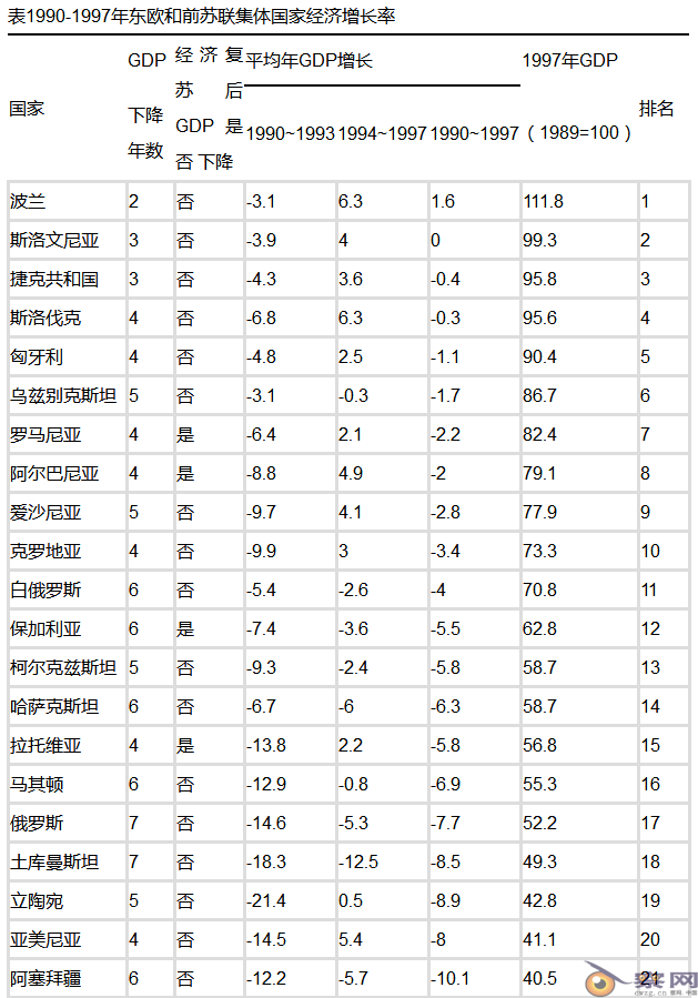 苏联解体后,东欧苏联集团国家基本都选择了休克疗法,将计划经济转变为市场经济,如上表所示,除波兰外,各国1997年的国内产出均比1989年下降,其中下降最严重的格鲁吉亚(或译作乔治亚)共和国,1997年国内产出只有1989年34%,俄罗斯下降了近一半。俄罗斯人均寿命大幅度下降,男性人均寿命从1987年的65.1岁下降到1987年的57.3岁[27]。波兰实行休克疗法时,同样在短短一年里,工业品产值下降40%,通货膨胀率最严重时,高达250%,经济濒临崩溃,不得不于1993年改弦更辙,实施新的波兰战略,才成功地摆脱经济危机,经济开始增长[6]。